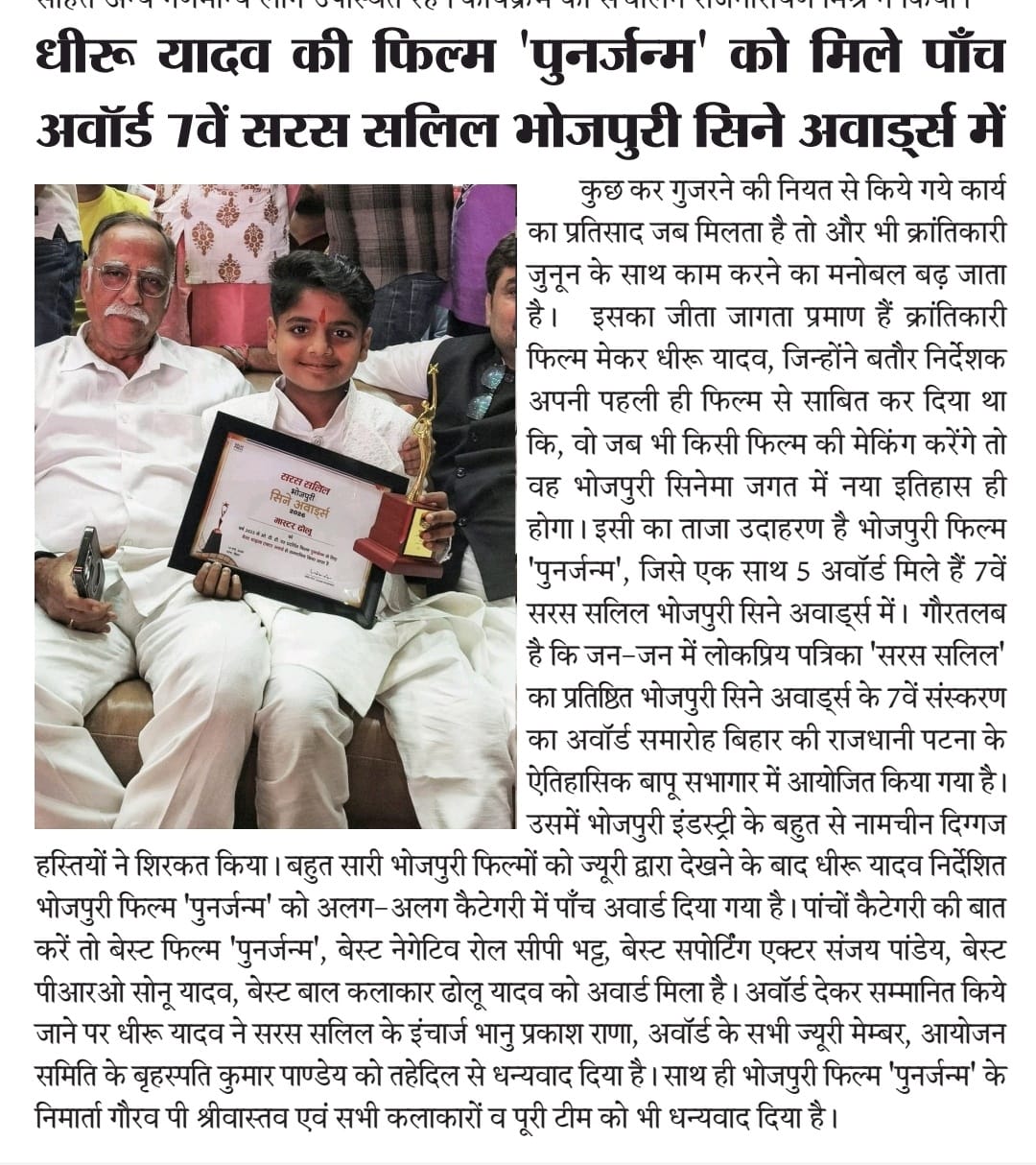 उत्तर प्रदेश की राजधानी लखनऊ में आगामी अप्रैल महीने में छठे 'सरस सलिल भोजपुरी सिने अवार्ड्स' का आयोजन होगा. पर अब तक इस अवार्ड्स शो का सफर बड़ा ही रंगारंग और दिलकश रहा है. साल 2020 में पहले साल इस अवार्ड्स शो का आयोजन उत्तर प्रदेश के बस्ती जिले में 'बादशाह मैरिज हाल' में कराया गया था, जिस में भोजपुरी सिनेमा के सुपरस्टार रवि किशन के अलावा अरविंद अकेला कल्लू, शुभम तिवारी, विमल पांडेय, काजल राघवानी, रितु सिंह, कनक यादव जैसे बड़े सितारों ने अवार्ड जीते थे. भोजपुरी में सब से ज्यादा फिल्में करने वाले बृजेश त्रिपाठी को 'लाइफटाइम अचीवमैंट' अवार्ड से नवाजा गया था.